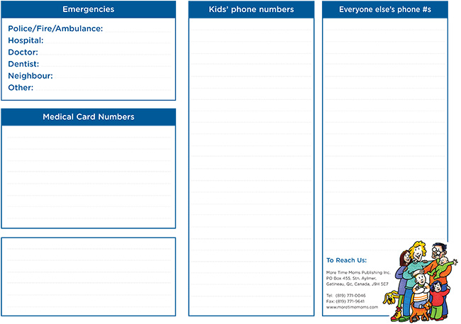 On the back of the December page is more space for writing. There are grids there for Emergency Numbers, Medical Card Numbers, Kids' phone numbers, Everyone else's phone numbers and a blank for your use.